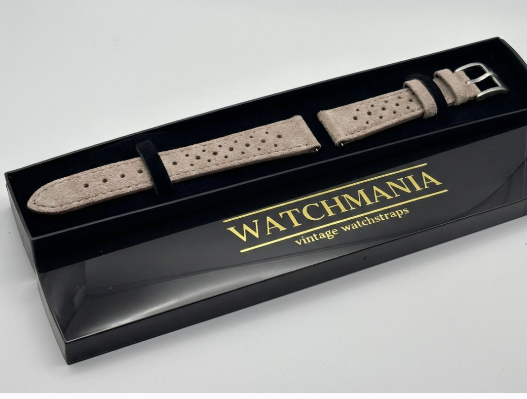 Ervaar ultiem comfort met onze Natuurlijke Bruine Suède Racing Band. Met de hand vervaardigd van hoogwaardig omgekeerd kalfsleer, biedt deze vintage-geïnspireerde racing horlogeband uitzonderlijke zachtheid en verfijnde stijl voor uw Omega Speedmaster, Rolex Daytona, Heuer Autavia of elk klassiek sporthorloge of chronograaf.